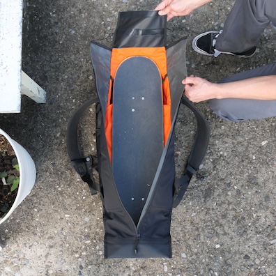 また、”Wedge”はスケートボード収納可能な形状に変形します。 スケートボード収納スペースはメイン収納部から独立しており、開口部が背面にあるので他の荷物を収納したまま素早くスケートボードを出し入れすることができます。